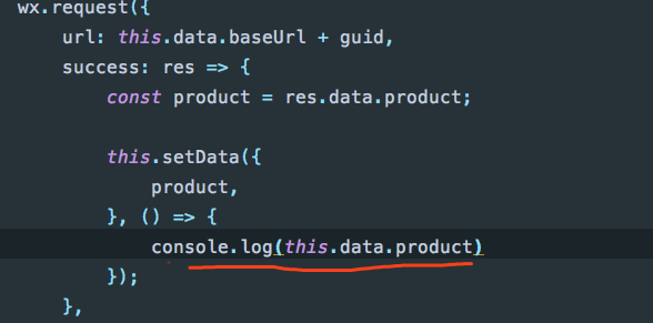 在request外面添加一个const that = this;打印的时候用console.log(that.data.product)