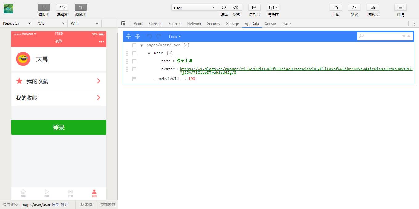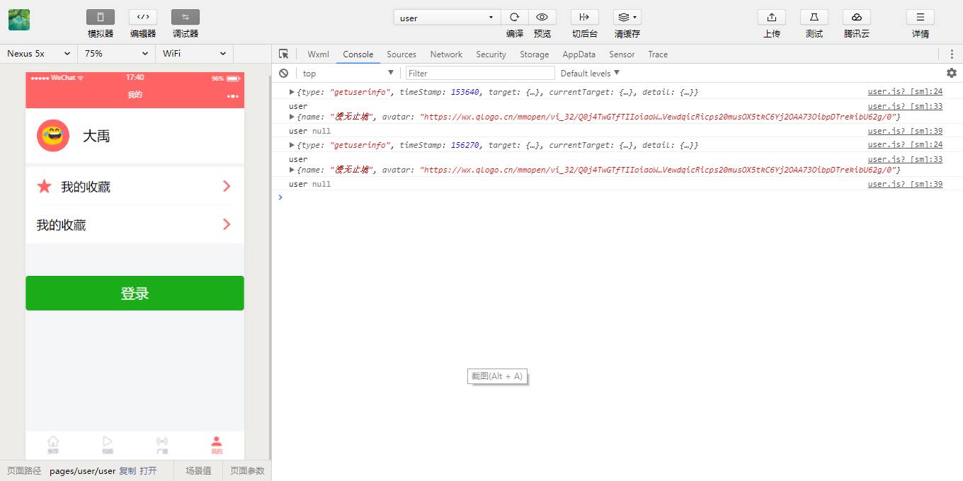 login:function(e) {console.log(e)let name = e.detail && e.detail.userInfo && e.detail.userInfo.nickNamelet avatar = e.detail && e.detail.userInfo && e.detail.userInfo.avatarUrlname && avatar &&this.setData({user: {name: name,avatar: avatar}})console.log('user',this.data.user)},logout:function() {this.setData({user:null})console.log('user',this.data.user)},更改data的代码如上