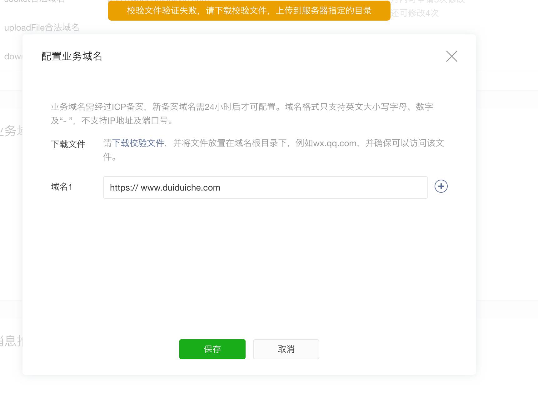 在小程序设置下面配置业务域名,已经下载了校验文件,并且确保在域名根目录下面能够访问到该文件,而且域名已经icp备案,但是还是提示失败! appid: wx45c69fc548833c28