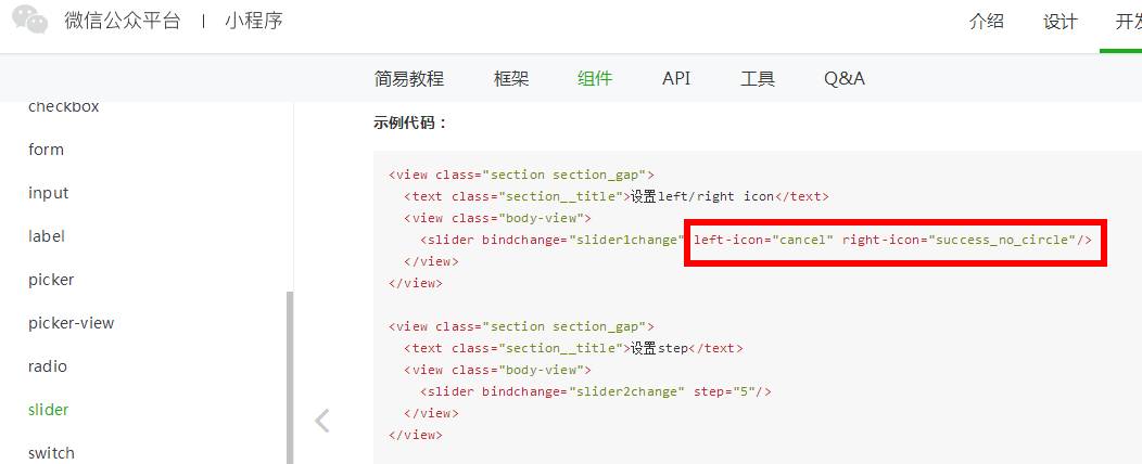 <slider bindchange="slider1change" left-icon="cancel" right-icon="success_no_circle"/>