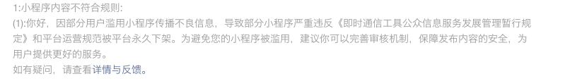 首先我们对(即是通信工具公众信息服务发展管理暂行规定)下称(规定)进行了了解,认为我们的小程序与(规定)内所涉及的内容并无关联。我们的小程序就是一款通过语音形式说出口令或领取赏金的口令赏金小程序,用户无法在上面发布图文等不良信息,而且我们也对敏感性词组做了限制,只能用于聊天群内答谢,聊天互动等场景。且我们对每条口令的字数限制在15个字以内,不存在被用户滥用传播不良信息的基础。希望审核团队能够对我们的使用场景进行了解后通过一下审核,若还有需要修改的地方请明示,我们一定会按照你们的指示修改,小程序我们已经开发了几个月,我们是家公司,产品一直不能上线,对于我们压力很大,并且公司投入了大量的成本,希望审核团队能给出有效的解决方案!谢谢!