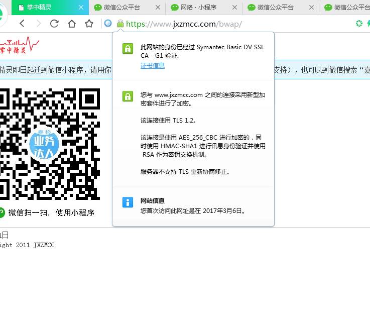 我的小程序登录,多款苹果手机都可以正常访问执行wx.request,但是安卓不能执行,测试多款手机都不行,走到了fail里面,报错信息为:request:fail ssl hand shake error。域名是 https://www.jxzmcc.com/bwap,登录执行的访问URL是:https://www.jxzmcc.com/bwap/app/login.jsp,参数有两个:data: {loginCode:loginCode,loginPass:loginPass},登录帐号和密码,我百度下报错信息说是证书的问题或TLS版本问题,按说有问题应该都有问题,可是苹果手机正常啊,浏览器访问也正常,浏览器访问如下图,没看出哪里不正常啊,到底是怎么回事呢?