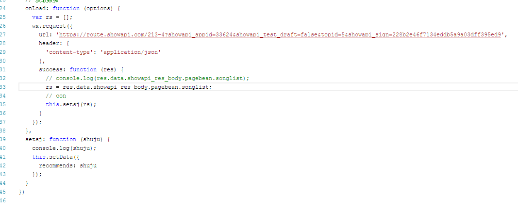 var rs = []; wx.request({ url: ', header: { 'content-type': 'application/json' }, success: function (res) { console.log(res.data.showapi_res_body.pagebean.songlist); rs = res.data.showapi_res_body.pagebean.songlist; that.setsj(rs); } }); }, setsj: function (shuju) { console.log(shuju); this.setData({ recommends: shuju });