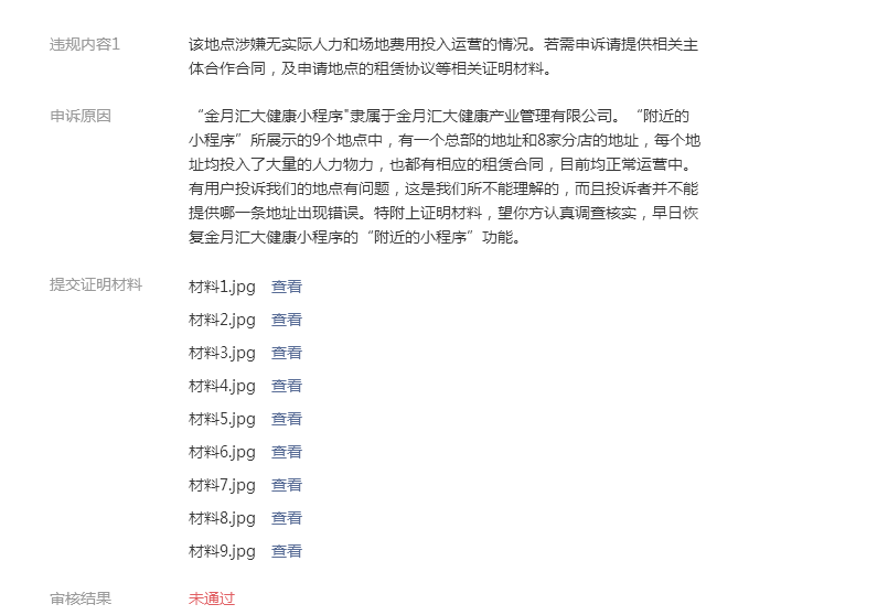 你好,金月汇大健康小程序"隶属于金月汇大健康产业管理有限公司。“附近的小程序”所展示的9个地点中,有一个总部的地址和8家分店的地址,每个地址均投入了大量的人力物力,也都有相应的租赁合同,目前均正常运营中。有用户因行业竞争问题投诉我们小程序设置的地点有问题,然后导致“附近的小程序”地址功能被封禁,之后我们提交了申诉的资料,包含总部和各店的营业执照,子母关系情况说明以及租赁合同,但是审核反馈的意见依然是未通过,如果这些资料都无法证明我们的真实经营地址以及情况,那请问还有哪些资料可以证明?急盼回复,谢谢!