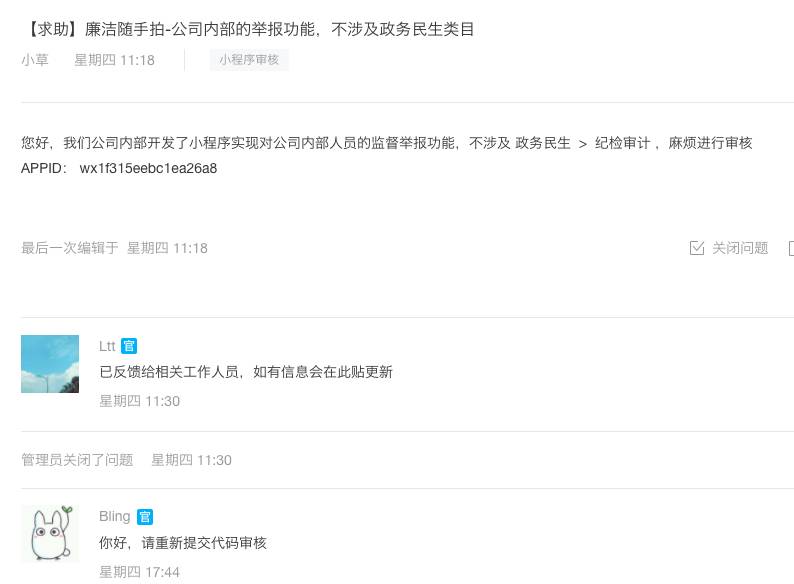 您好,我们公司内部开发了小程序实现对公司内部人员的监督举报功能,不涉及 政务民生 > 纪检审计 ,麻烦进行审核
