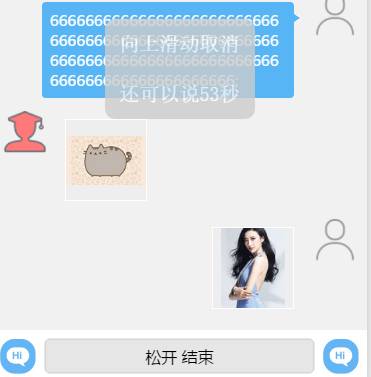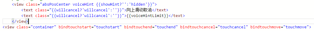 代码片段截图 touch事件我都是绑在最上层的元素,然后与那个读秒的提示框是并列关系,之前是包含关系也还是一样的。 下面是部分代码: //计时器 var counter = { cnt:60, now:60, hander:undefined, begin:function(pageCxt){ var _that = this; _that.now=_that.cnt; _that.oneSecond(_that,pageCxt); }, end:function(pageCxt){ sendVoice.apply(pageCxt); }, oneSecond:function(that,pageCxt){ console.time('t'); if(that.now>0){ that.hander = setTimeout(function(){ console.log('-------------------') console.timeEnd('t'); that.now--; that.oneSecond(that,pageCxt); if(that.now<60){ pageCxt.setData({ voiceHintLimit:'还可以说'+that.now+'秒' }); }else{ pageCxt.setData({ voiceHintLimit:'' }); } if(that.now==0){ that.end(pageCxt); } console.log(that.now); },1000); }else{ that.init(); } } , init:function(){ this.now=this.cnt; if(this.hander){ clearTimeout(this.hander); } } } //录音的 var lastVoiceRecordTmpPath; var willUploadVoice = false; function recordVoice(){ var _this = this; willUploadVoice = false; wx.startRecord({ success: function(res) { console.log(res); var lastVoiceRecordTmpPath = res.tempFilePath; console.log(lastVoiceRecordTmpPath); if(willUploadVoice){ voiceupload({path:lastVoiceRecordTmpPath,uid:'1234567890',seconds:willUploadVoice.seconds},_this); } }, fail: function(res) { wx.showToast({title:"录音失败"}); } }) this.setData({ recordVoiceBtnText:'松开 结束' ,showHint:true ,willcancel:false }); counter.init(); counter.begin(this); } //录音的touch事件 function touchstart(e){ console.log("touchstart",arguments); var id = e.target.id; if(id=='voicebtn'){ recordVoice.apply(this); moveUpJudge.init(); moveUpJudge.setP('begin',e); } } //下面是mousemove的 //moveUpJudge.judge()只是判断一个跟起始点的距离 function touchmove(e){ //console.log("touchmove",arguments); var _that = this; if(moveUpJudge.isBegin()){ moveUpJudge.setP('end',e); if(moveUpJudge.judge()){ //变色 if(willcancel==false){ willcancel = true; _that.setData({ willcancel:willcancel }); } }else{ if(willcancel==true){ willcancel = false; _that.setData({ willcancel:willcancel }); } } } } | ||