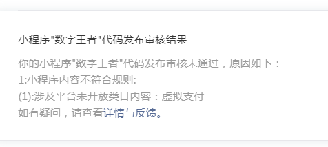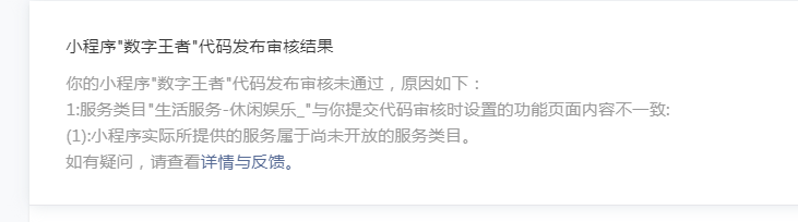 我们这边看头脑王者大火,仿造其制作了一个猜数字的游戏,一共提交了五次,前几次都是以涉及虚拟支付审核不通过(好像头脑王者也有明显的虚拟的支付吧!而且最近还更新了,之前官方在某个帖子说会对线上的小程序涉及虚拟支付做处理的?不知官方作何解答);当然说虚拟支付不许做,那我们就改了,毕竟被微信官方捏着喉咙做开发,于是去了虚拟支付了,前几天又提交了一份,今天审核不通过说 小程序实际所提供的服务属于尚未开放的服务类目。