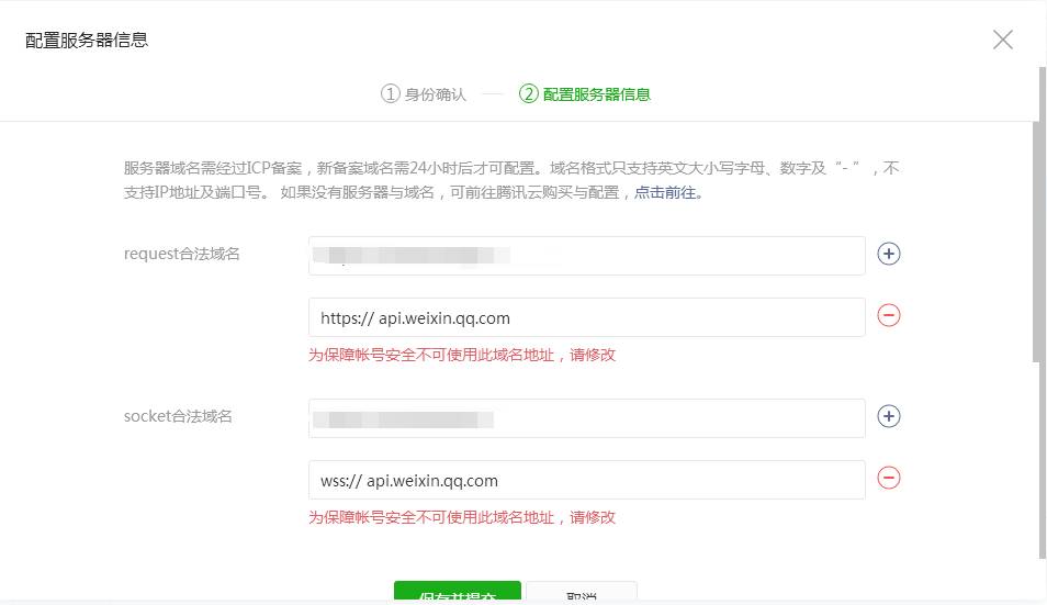按照开发文档配置的域名,配置不进去,第一次可以保存成功了,后面因需求关系需要增加域名,结果保存不了。