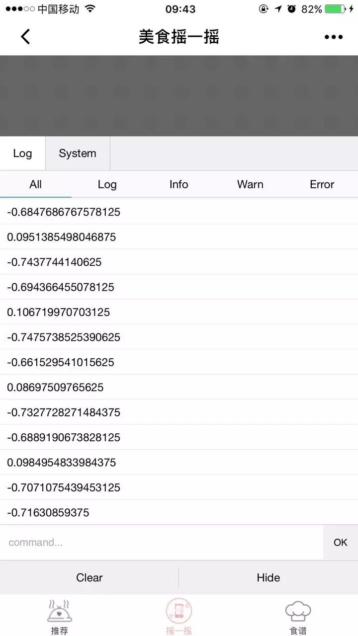 目标是想实现有三个tabbar,在其中一个tabbar的js里面写onShow启用重力感应API(模拟摇一摇功能),然后在onHide里面清空方法,切换tabbar的时候在其他tabbar里面仍然可以获取到重力感应数据,导致在每一个tabbar下面都可以进行摇一摇的操作,目的只想在其中一个tabbar里面实现重力感应也就是摇一摇操作。 第一次进入程序“推荐”和“食谱”都没有启用重力感应API,点击“摇一摇”tabbar启用重力感应API获取到数据,之后在切换“推荐”和“食谱”tabbar以后三个均能获取到了,每个tabbar都可以摇一摇了 | |||