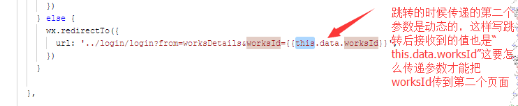 wx.redirectTo传递参数时如图,第二个参数传递的是“this.data.worksId”,并不是动态的worksId的值,动态的值应该怎么写才能传递?