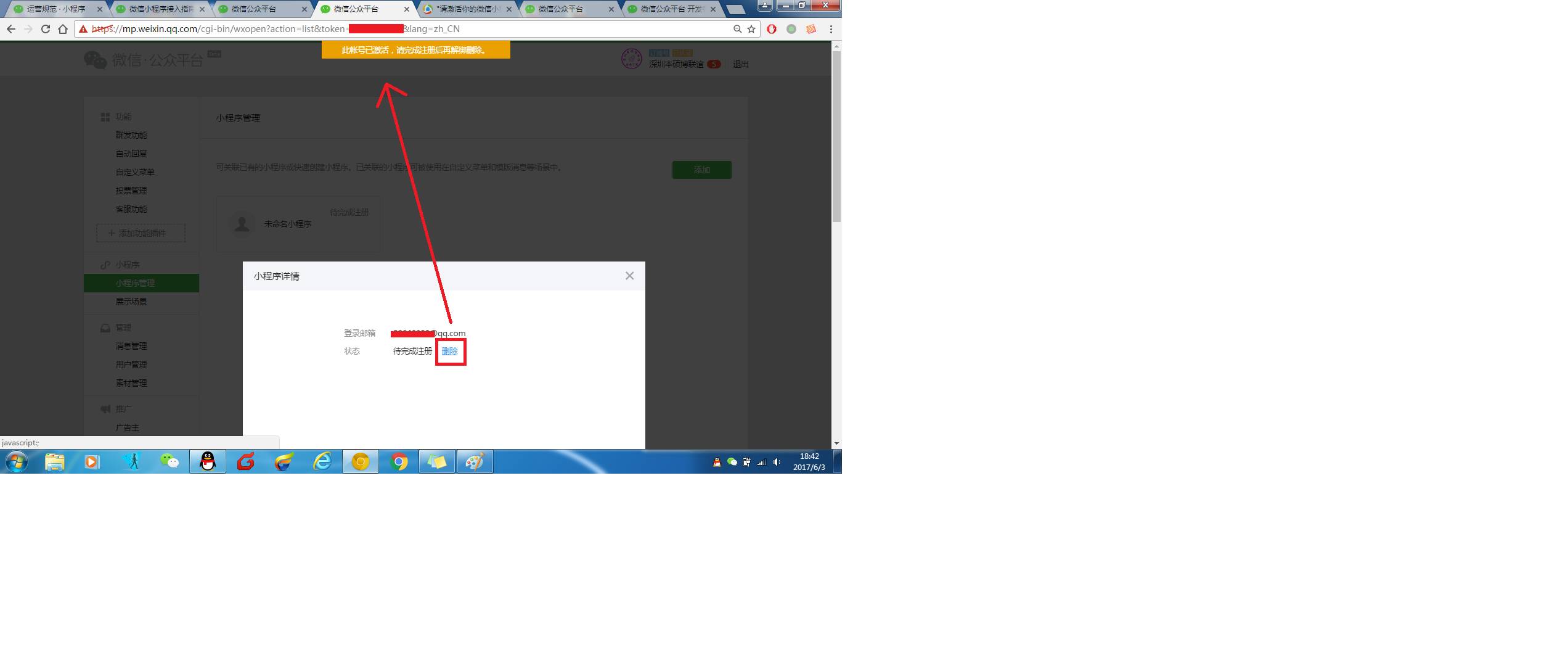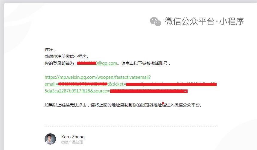 注册的时候,发送邮件之后,点开了2次,都没有完成提交,后面激活链接就点不开了,如下图2。现在无法添加小程序,也无法继续注册下去了,求救。