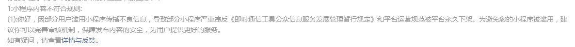 后面已在小程序增加了举报和后台审核功能,再次提交还是因为上述原因未通过,审核人员能否详细告知应该如何修改。
