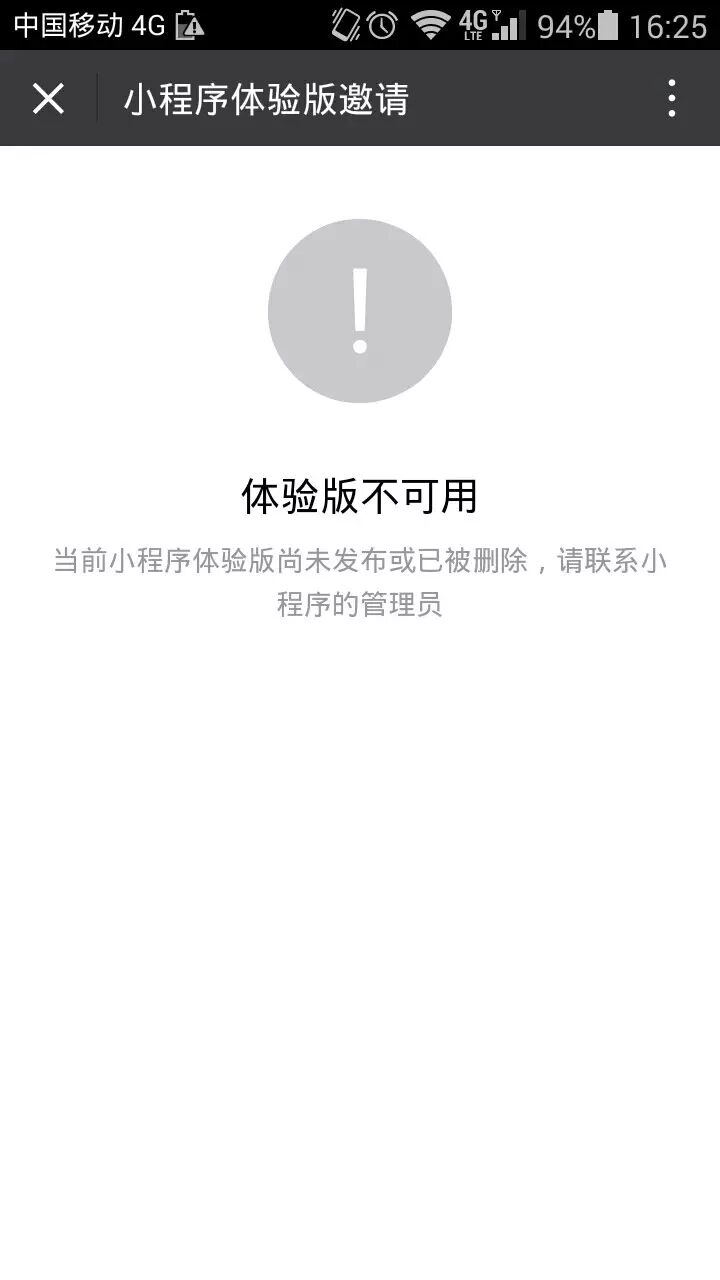 小程序开发版本上传完毕后,已经生成二维码,但继续扫描进入体验版时报错,如下图所示: