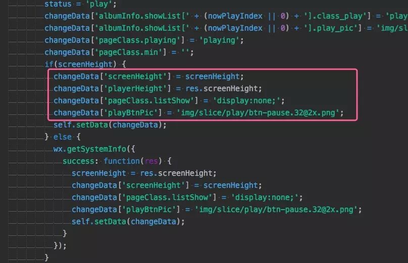 在上面的代码中,可以看到 general 里暴露了一个 getScreenHeight 方法,它用于获取屏幕高度,我们在 onLoad 的时候通过它,将设置了背景色的结构的 min-height 属性值设为屏幕高。用 js 的原因是,开发者工具 0.10 把 <page> 的高度 100% 去掉了,所以在 wxss 中就不能设置 height: 100% 把屏幕高度继承下来,但我们又要保证在页面资源加载出来以前,用户看到的就是全屏的暗色背景。