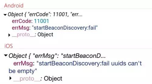 对于wx.startBeaconDiscovery这个API,在由于uuid数组为空时,fail的时候回调的数据是不一致的如图: