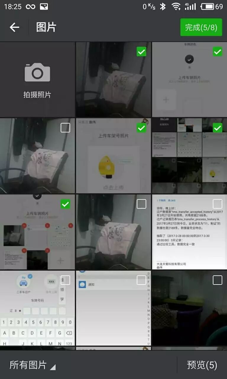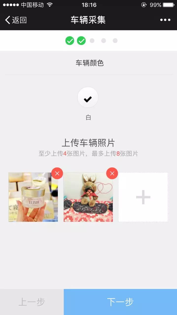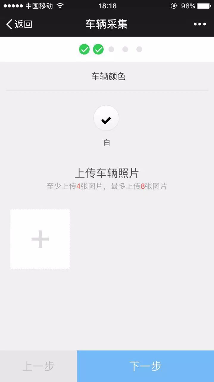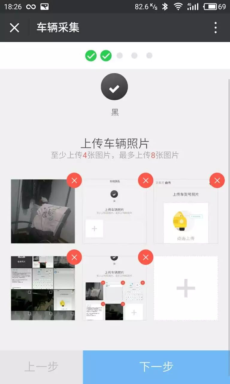 图片选择顺序 1.椅子 2. 上传车辆照片 3. 上传车架号照片 4.照片选择 5. 上传车辆照片完成画面