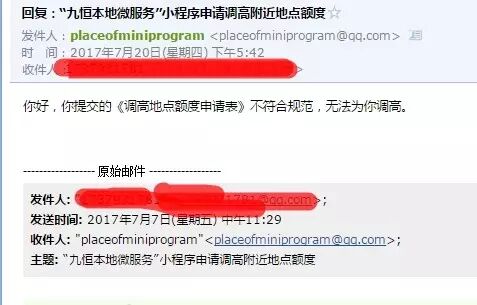 从6月初我就开始申请到现在,找不到人了!!!我是做传统代理加盟生意的,我的合作伙伴都是加盟的,然后10个名额的附近小程序我都是用加盟的形式申请通过了,然后申请调高的全部都是按照这个意思写的,为什么通不过,然后回复我说“你好,你提交的《调高地点额度申请表》不符合规范,无法为你调高。”这样我怎么知道那里不规范了,都是按照你们的表格填写的,然后也已经通过了10个,为什么提交的就不行了呢?人家农行、肯德基那些大品牌都过了,能不能讲清楚?咨询你们QQ客服说我的没问题了才提交的,给个能有审核权的说一下好吗?谢谢!因为你们客服说好了都不算,还是看审核的人!
