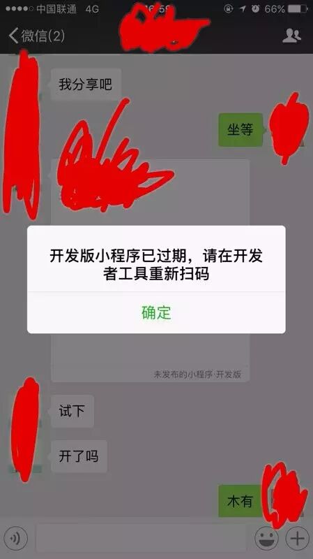 将朋友绑定为体验者,将未发布的小程序开发版分享给他,页面弹出开发版小程序已过期,请在开发者工具重新扫描;(效果如图);这个效果跟苹果手机(绑定为开发者)分享后打开的效果是一样的;