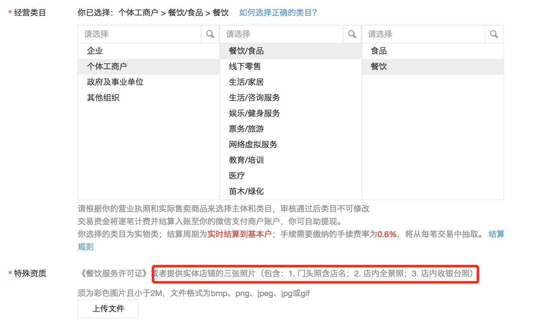 如果实在需要这个类目,因为这是个新店,食品和卫生许可证都在办理过程中,可否像微信支付那样提供门店三张照片来确认呢?