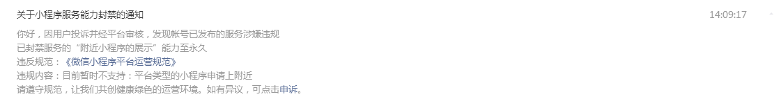 你好,因用户投诉并经平台审核,发现帐号已发布的服务涉嫌违规已封禁服务的“附近小程序的展示”能力至永久违反规范:《微信小程序平台运营规范》违规内容:目前暂时不支持:平台类型的小程序申请上附近请遵守规范,让我们共创健康绿色的运营环境。如有异议,可点击申诉。