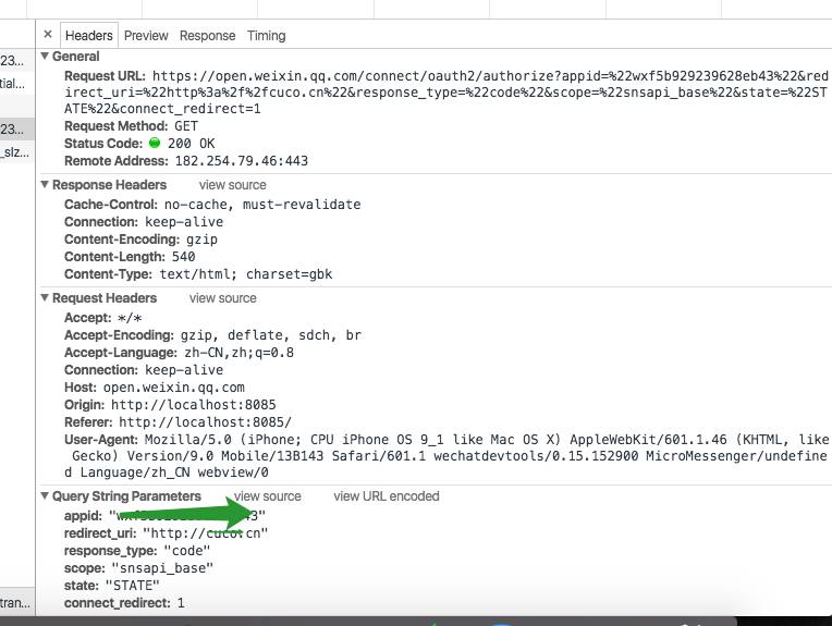 'https://open.weixin.qq.com/connect/oauth2/authorize?appid="wxf5b929239628eb43"&redirect_uri="http%3a%2f%2fcuco.cn"&response_type="code"&scope="snsapi_base"&state="STATE"#wechat_redirect'本地开发 用的微信开发者工具, 调用用户同意授权接口