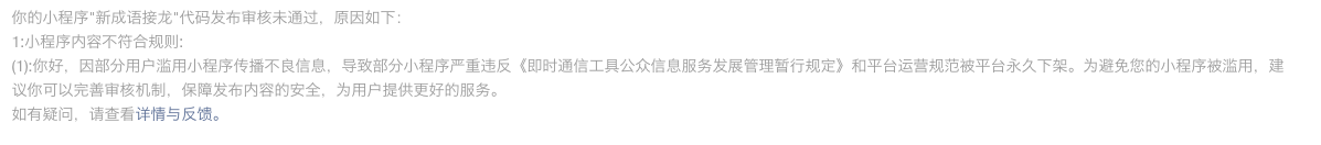 你好,我们的小程序只能发布四字成语,用户的发布的内容必须是成语才行,用户无法在上面发布图文等不良信息,不存在被用户滥用传播不良信息的行为,希望审核团队能够查明一下。