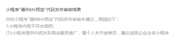 你好,经核实,贵方小程序页面展示内容为“福州金樽夜总会”官方商业介绍内容,暂不支持个人主体推广商业服务,建议选择企业小程序