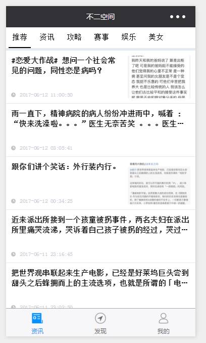 页面是这样的,我把资讯这个tab分享出去,带了这个页面的id,name等字段,大致格式就是这样的 ‘pages/news/news/id=1234&name=不二空间’。