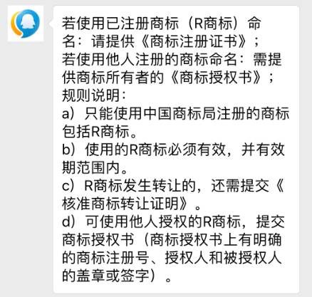 首先,注册过程中的一些问题。名称中涉及到商标的问题。根据腾讯公众号智能客服的回答,