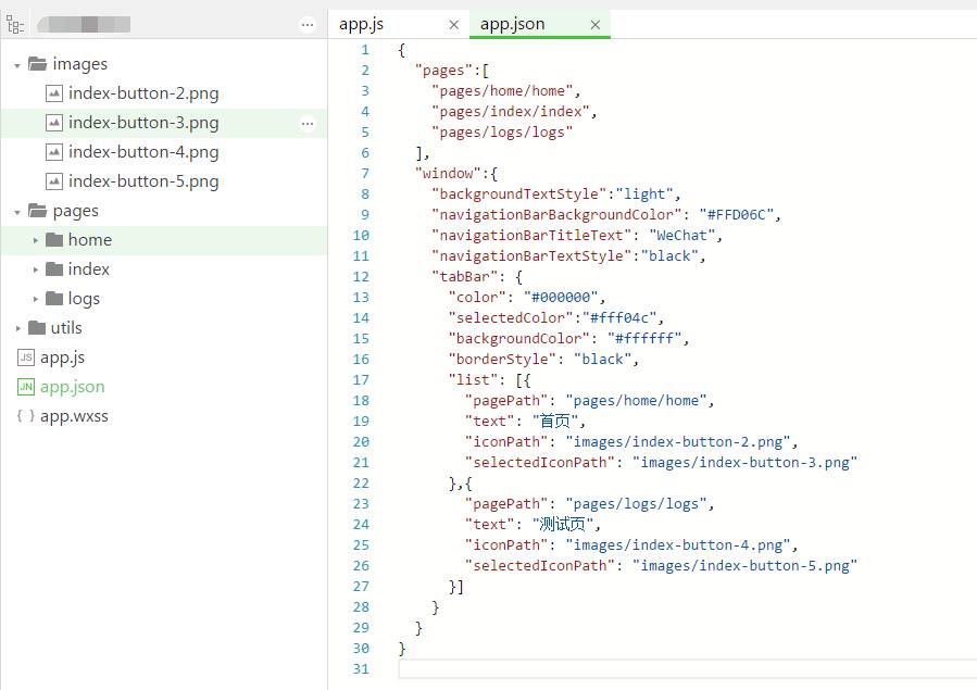 LZ你的tabBar配置项写错位置了,tabBar不是window对象里面的属性,它应该与window属性同一级