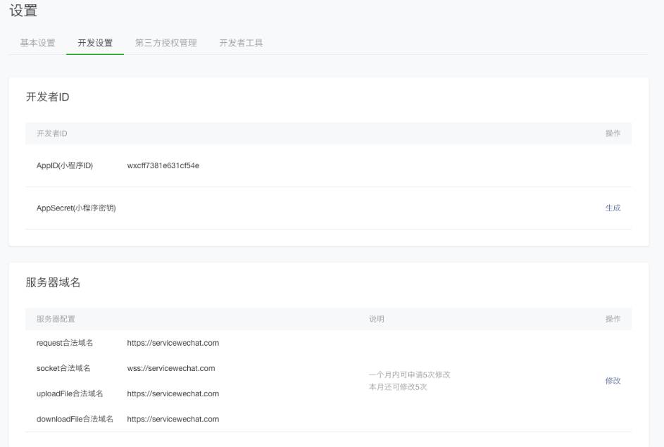 微信公众号登录小程序账号。进入小程序后台。左侧菜单栏最后一个设置,开发者设置,下面就有服务器域名呀 - -你是不是登错账号了