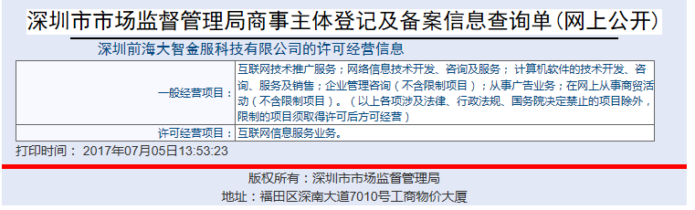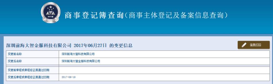 另外,我们公司刚刚更新了公司名字,从“深圳前海大智科技有限公司”变更为“深圳前海大智金服科技有限公司”,两者属于同一公司,也有截图。