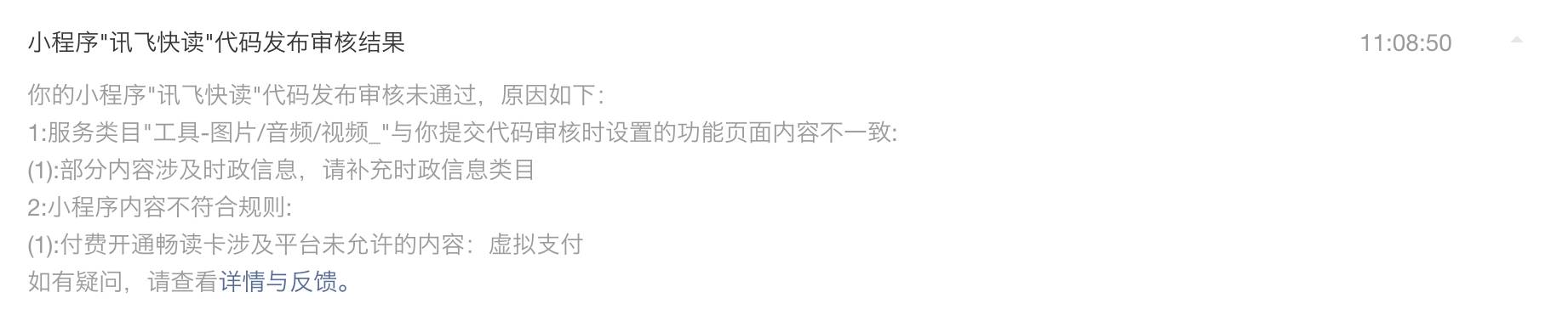 你好,经核实,贵方2017-12-18,16:44:28提交代码审核的版本,1、【朗读员】中的“彬哥-新闻”不涉及时政;2、付费(赞赏)开通畅读卡,属于虚拟支付;3、创建朗读后,“分享朋友圈”涉及平台未开放的类目内容:诱导分享朋友圈,建议去掉。