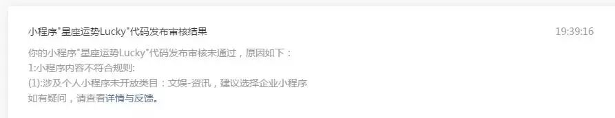 1:小程序内容不符合规则:(1):涉及个人小程序未开放类目:文娱-资讯,建议选择企业小程序