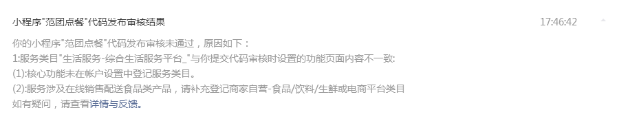 第二审核不通过反馈的结果如下图,提醒我们登记服务类目和设计在线销售配送食品类产品。这个我就不明白了,我们的小程序已经上线三个月了,期间提交更新不下10次,每次都能审核通过,这次怎么突然反馈这样的问题,弄的我们都不知道怎么去处理了。