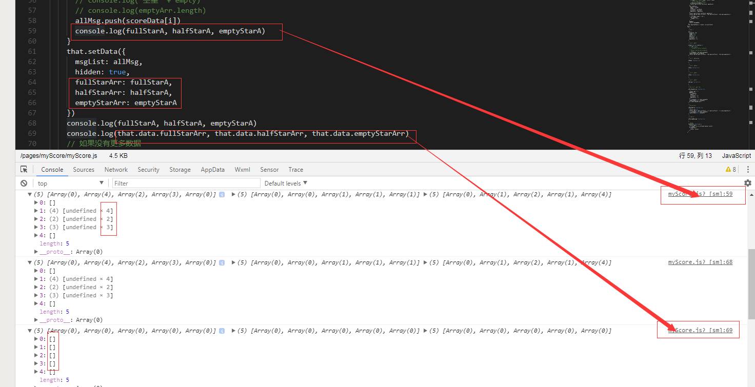 请看59行的时候(fullStarA)这个数组就是有内容的,之后把它们赋值给(fullStarArr),之后再打印data里的fullStarArr(69行),却是空的,为什么里面的二维数组都没了呢?