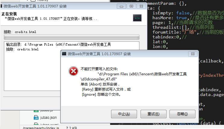 关闭开发者工具,把跟开发者工具相关的所有进程都干掉就可以安装了