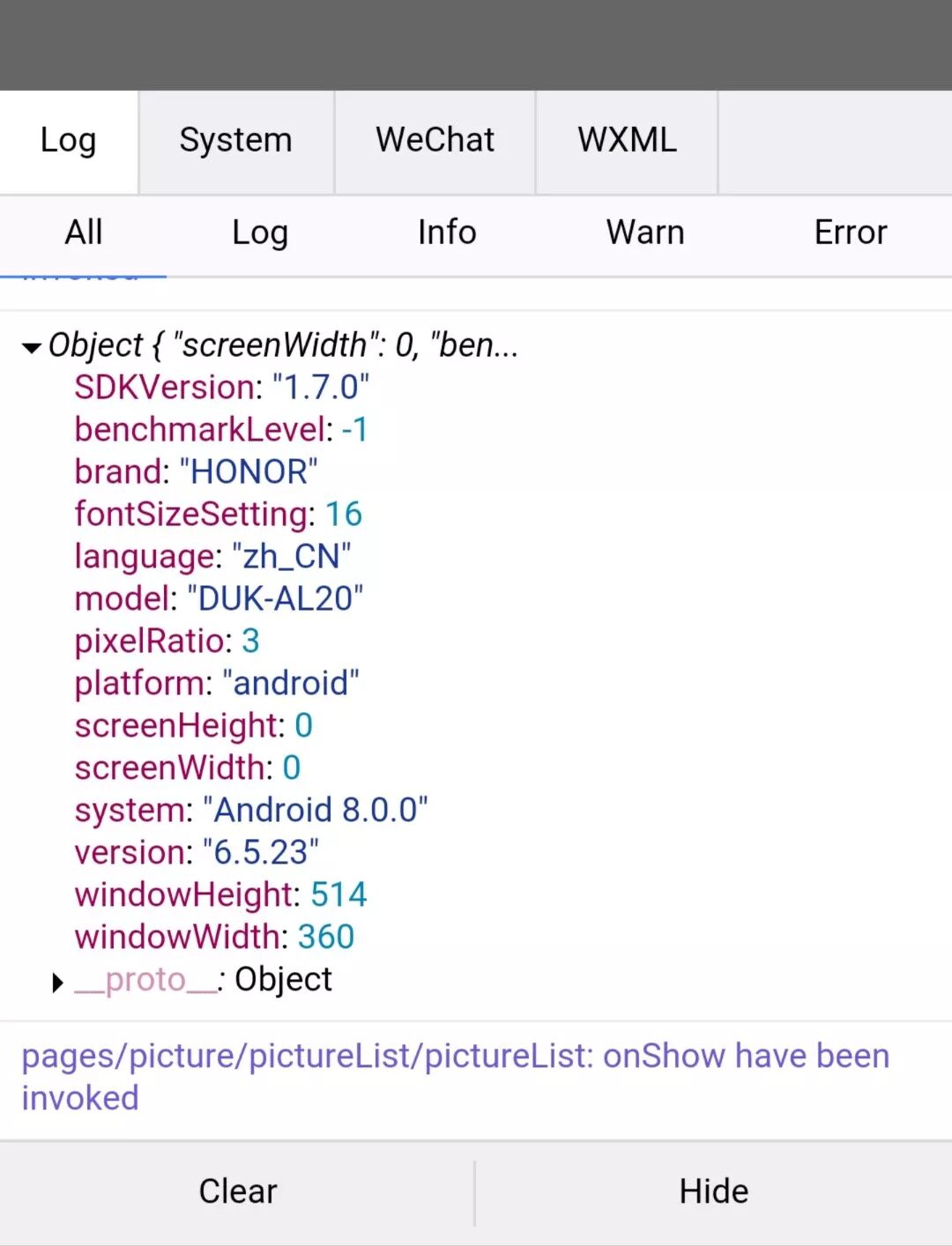 华为荣耀V9 ,通过wx.getSystemInfoSync()获取不到screenHeight和screenWidth,显示都是0,见下图: