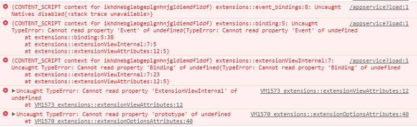 /appservice?load:1 (CONTENT_SCRIPT context for ikhdnebglabgeplgnhnjgldiemdflddf) extensions::extensionViewInternal:7: Uncaught TypeError: Cannot read property 'Binding' of undefined{TypeError: Cannot read property 'Binding' of undefined