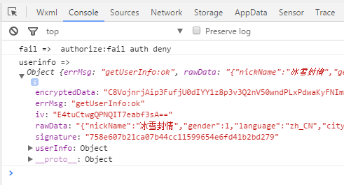 //app.jsApp({ onLaunch: function () { wx.authorize({ scope: 'scope.userInfo', success(res) { console.log('success => ', res.errMsg) }, fail(res) { console.log('fail => ', res.errMsg) wx.getUserInfo({ withCredentials: true, success(res) { console.log('userinfo => ', res) }, fail(res) { console.log(res.errMsg) } }) } }) }}) |