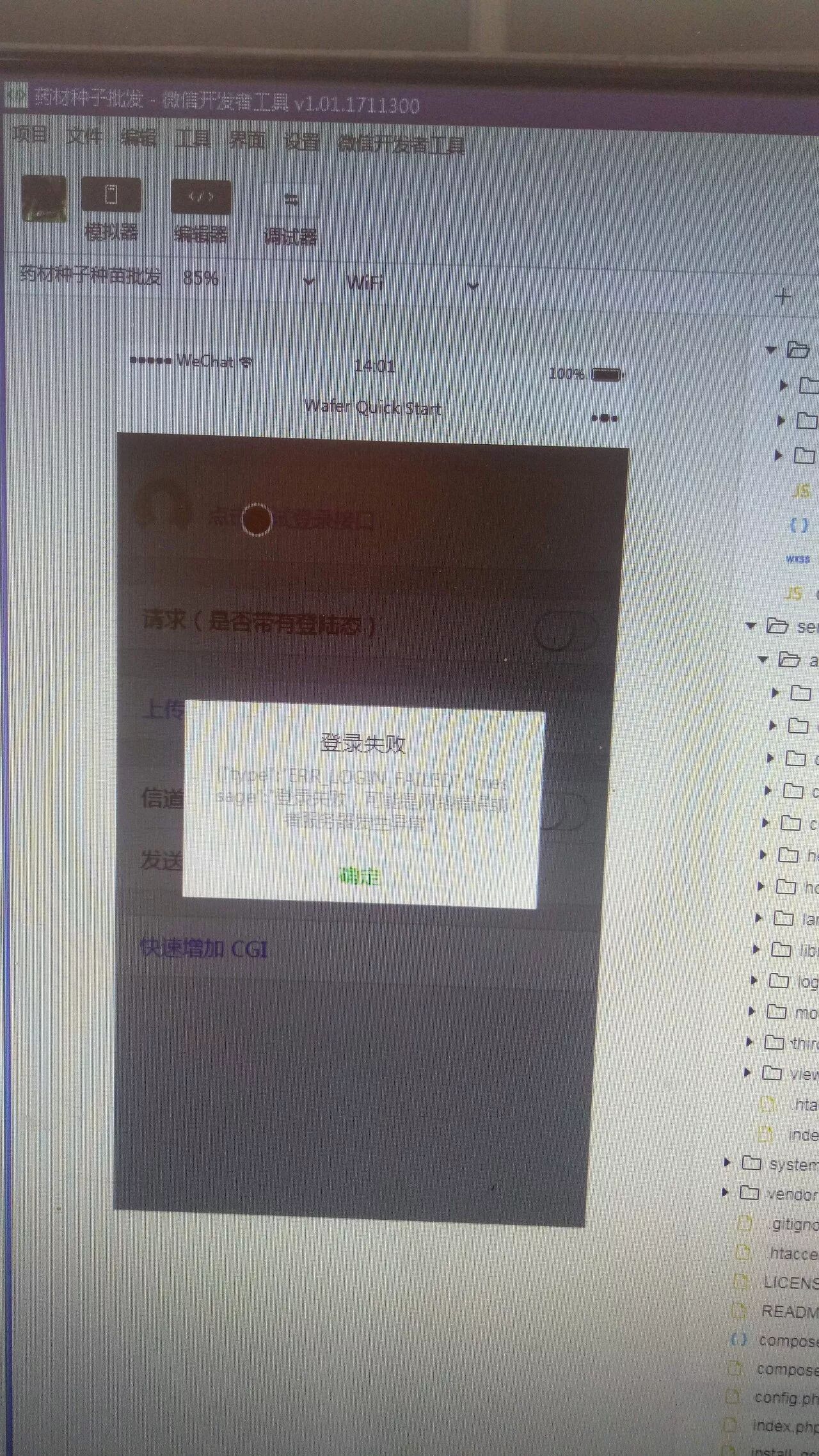 刚刚接触小程序,不知道怎么搞的,按照微信小程序的操作步骤一点点弄的,到测试时候还是显示 登录失败图片为证,请高手帮忙看看,怎么解决,谢谢