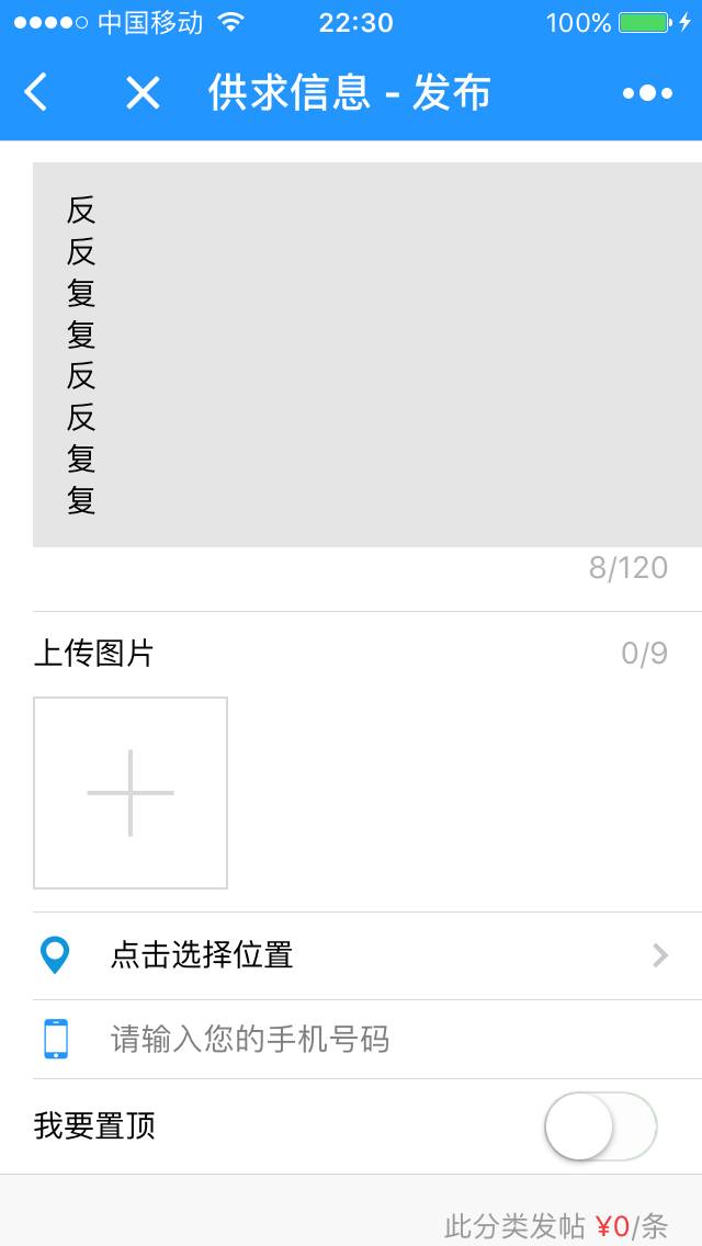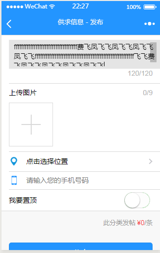 <viewclass="weui-cell"><viewclass="weui-cell__bd"><textareaclass="weui-textarea"bindblur="contentInput"bindinput="contentInput"placeholder="点击输入要发布的内容"value="{{content}}"style="height: 3.3em;width:100%"auto-height="true"maxlength="{{content_max}}"auto-focus="true"fixed="true"/><viewclass="weui-textarea-counter">{{content_count}}/{{content_max}}</view></view></view>/*** 页面的初始数据*/data: {title:'发布',pageHidden:false,//页面隐藏显示状态loading:false,//加载状态category_id:0,//分类IDcategory_name:'',//分类名称content:'',//内容phone:'',//手机号location: {},//定位信息content_count:0,//文本字数content_max:120,//文本最大字数uploads: [],//已上传的图片地址uploadmax:9,//最大图片数uploadall:false,//是否全部上传完成submiting:false,//提交状态switchTop:false,//是否置顶pay_fee:0,//发布金额pay_top: [],//置顶信息top_max:0,//最大置顶数top_surplus:0,//剩余置顶数array_top: [],//选项数组pay_day:0,//置顶天数},没有另外的css样式控制这个textarea宽度
