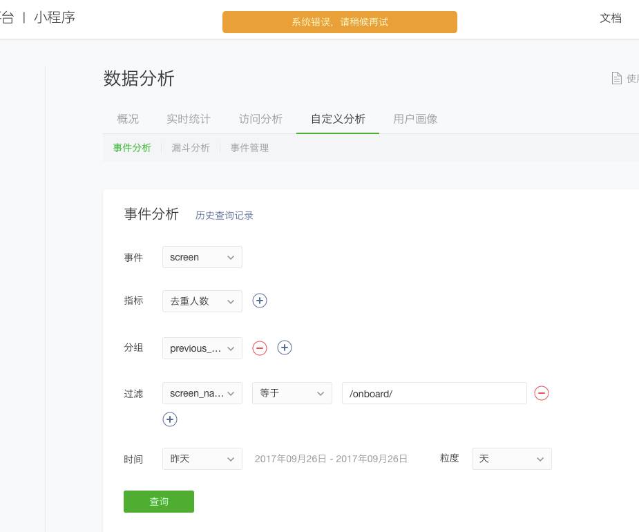 自定义查询就是小程序后台数据分析菜单下的自定义分析,查询事件总是提示失败。