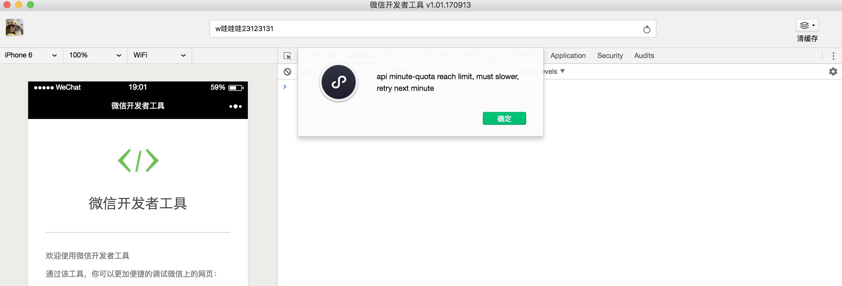 无论在微信公众号开发者工具输入什么url都显示说api调用太快,下一分钟再试。如下图。请问是怎么回事?