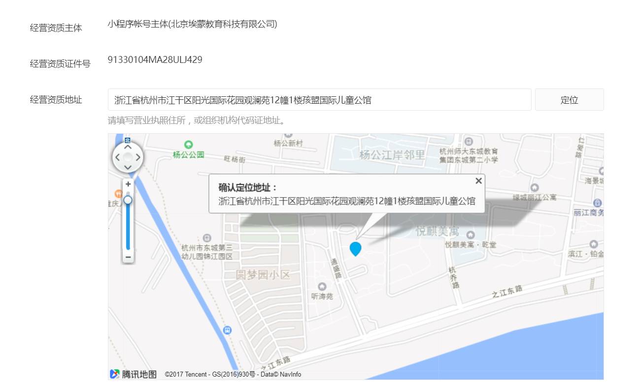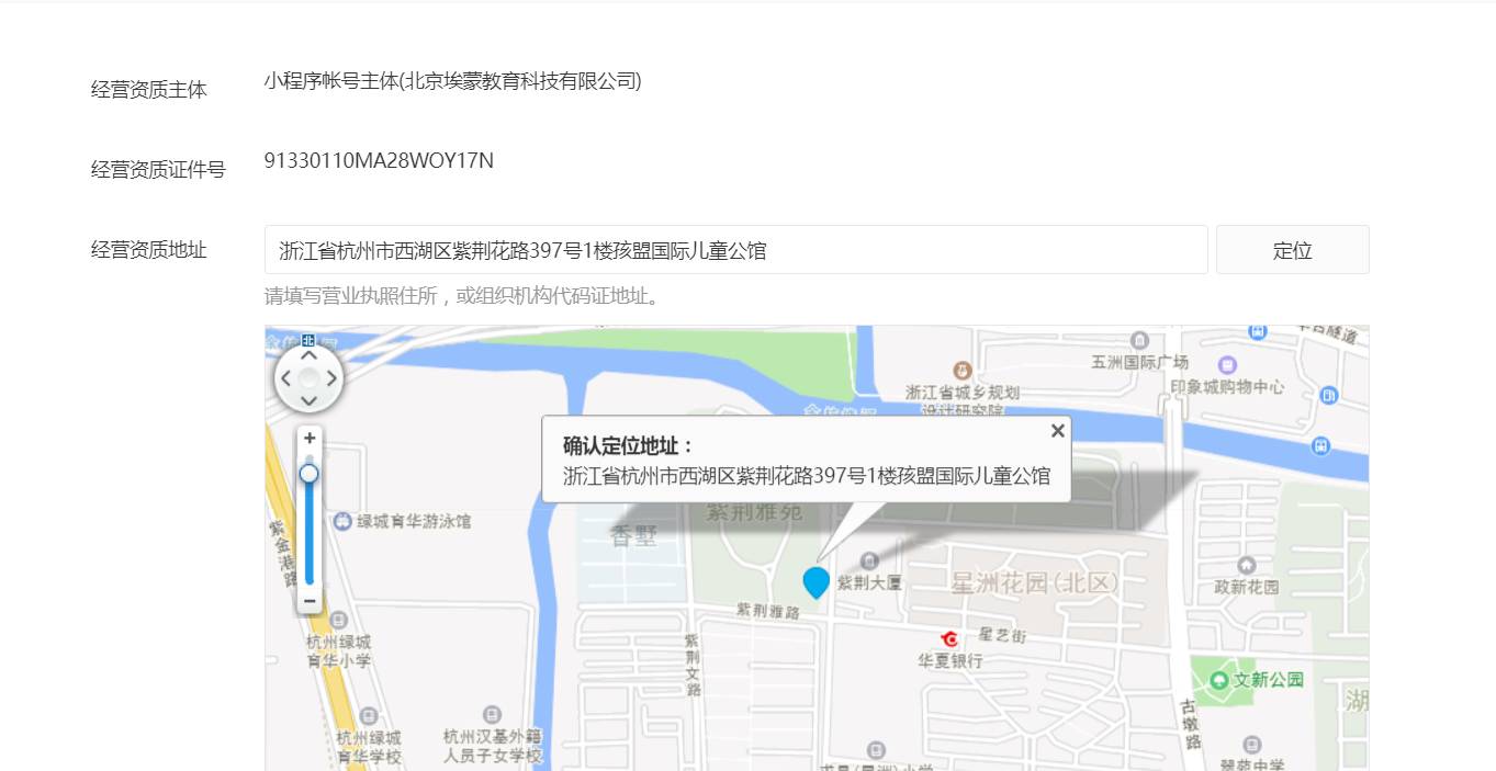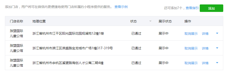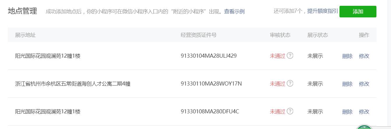 请问我的主体已经关联了公众号,我公众号的地址都已经审核通过了,但是附近的小程序为什么一直审核不通过呀?第一张是主体公众号的地址,后面是附近小程序添加的,APPID:wx7b80d181338a906b ;请帮忙看看,谢谢~~