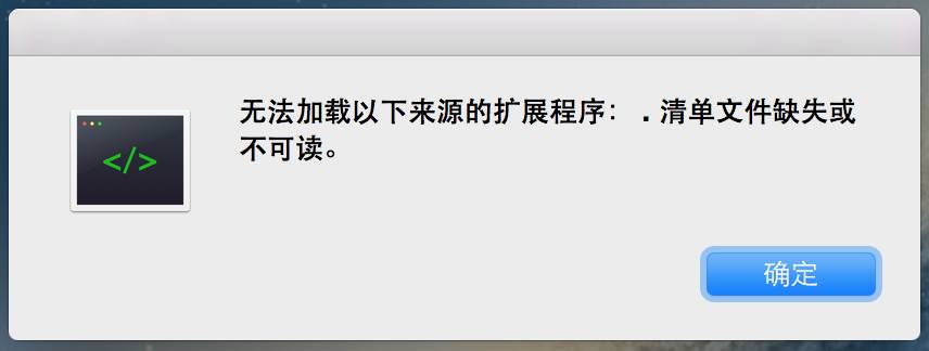 macbook打开 开发者工具,提示:无法加载以下来源的扩展程序:.清单文件缺失或不可读,如下图,点按确定后,开发者工具打开后完全没反应,就像死机了一样。麻烦帮忙看看是啥问题,多谢了