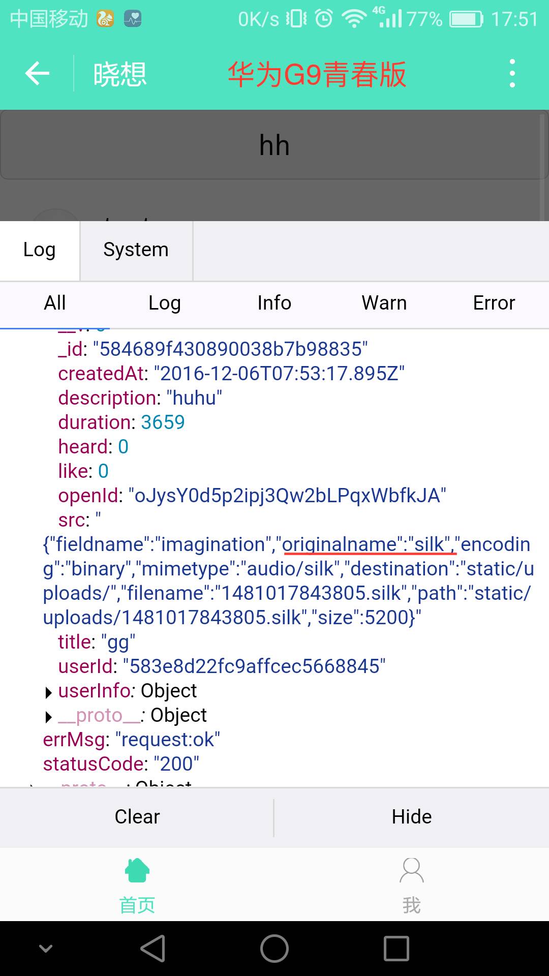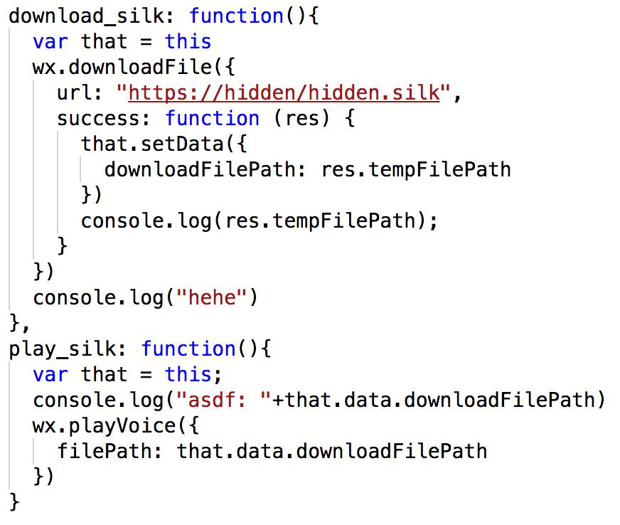 | 该小程序的目的是想实现:用户能上传自己录制的语音,并且能听到别人上传的语音。 使用 wx.startRecord 录音,获得录音文件的临时路径,此时调用 wx.playVoice 能正常播放刚刚录制的语音。 而通过wx.uploadFile将其语音文件上传到服务器后,再想通过wx.playVoice则 一直失败。 | ||