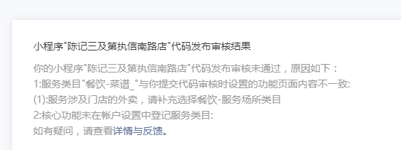 appid:wxa7fdbcb2347c1f23,是点餐系统,也有外卖,但都不通过是为什么。提供了服务场所类目审核时间多久?请客服大大解决一下,不然就要卷铺盖走人了....