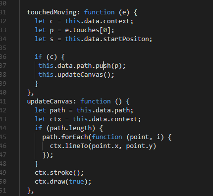 ctx.lineTo(event.changedTouches[0].x, event.changedTouches[0].y); ctx.stroke(); ctx.draw(true); } |