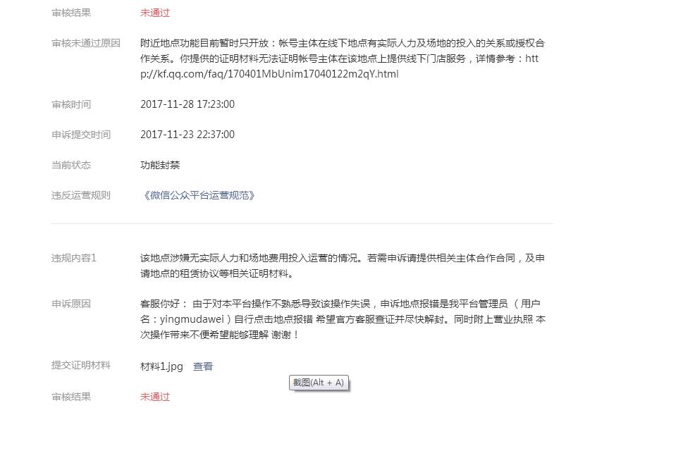 客服你好: 由于对本平台操作不熟悉导致该操作失误,申诉地点报错是我平台管理员 (用户名:yingmudawei)自行点击地点报错 希望官方客服查证并尽快解封。同时附上营业执照 本次操作带来不便希望能够理解 谢谢! 我已经上传营业执照了 怎么还封禁了啊!!从上个月20多号到现在了,希望尽快解决一下 位置也通过了怎么不在附近显示呢!! app ID wxf238325156345417